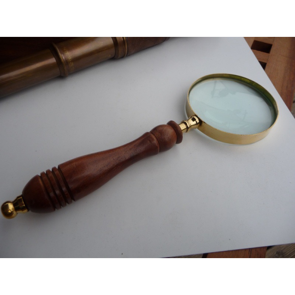 Loupe en laiton manche en palissadre vernis utilisée pour voir les petits détails et anotations sur les cartes marines .Longueur 18 cm , diamètre 6,3 cm