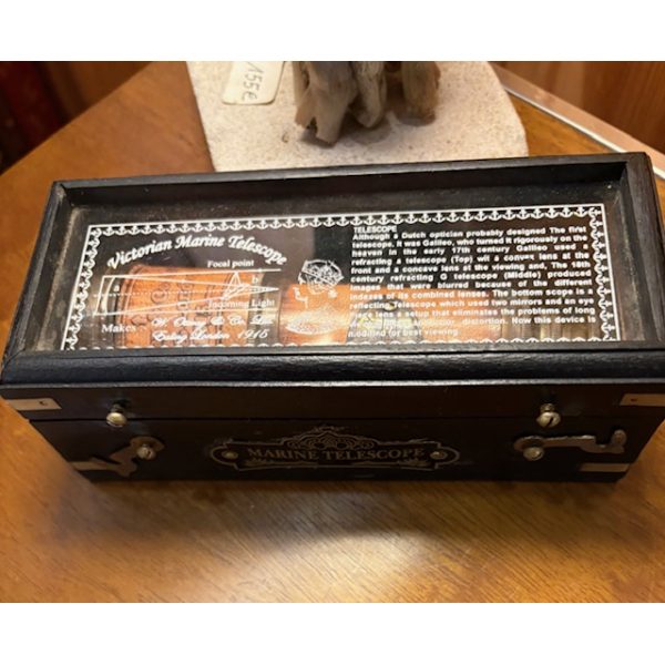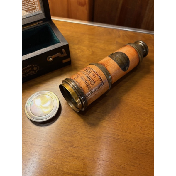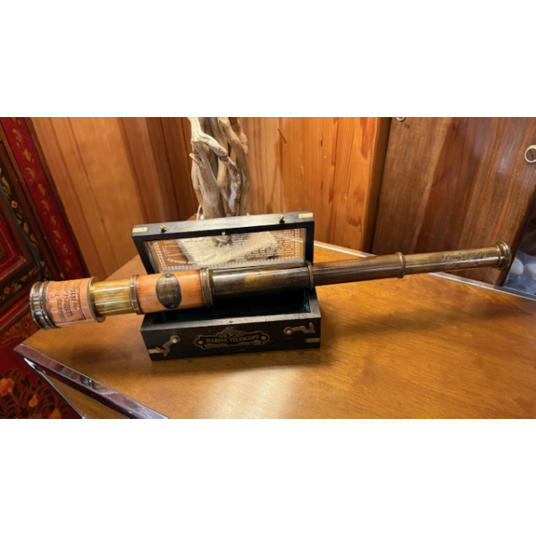 C'est un très belle réédition de longue vue ancienne marine que nous vous proposons. En lation vieilli et gainé de cuir, cette longue vue marine est livré dans son coffret vitrien en bois vernis. Le schéma du principe de fonctionnement est imprimé sur le couvercle en verre.