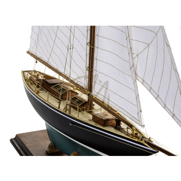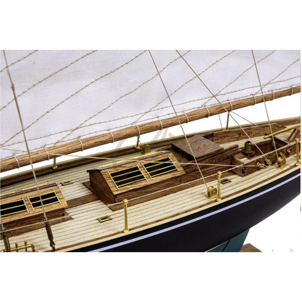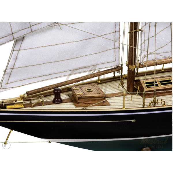 La réalisation est très soignée aussi bien pour les voiles et le gréement que pour la coque et le pont poulies en laiton